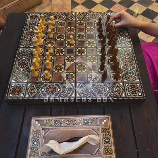 piezas de ajedrez de madera, ajedrez clásico, conjunto elegante, accesorios Damascus Box, juego de mesa de lujo, diseño oriental, regalo para él, regalo para ella