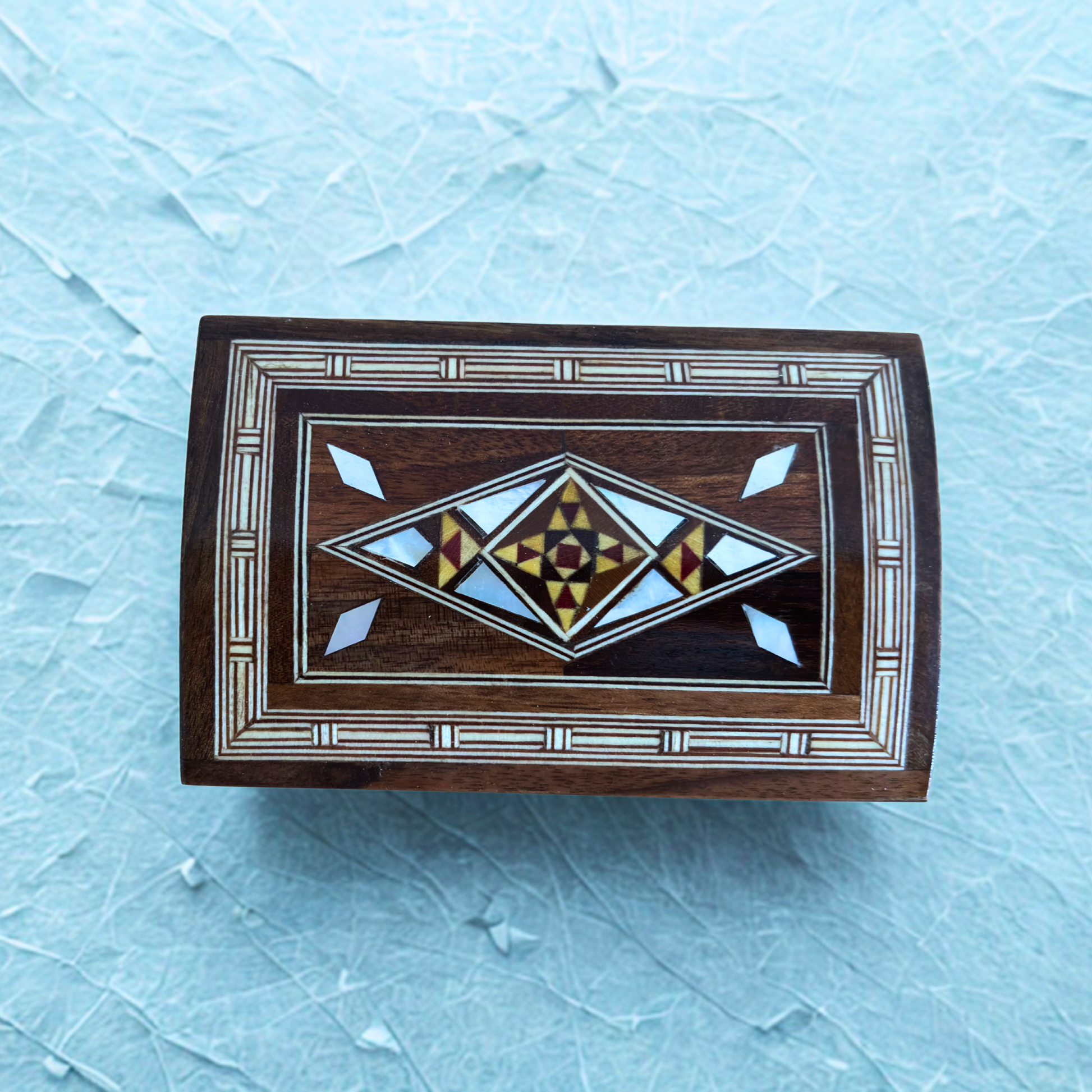 Esta elegante caja rectangular pequeña está cuidadosamente elaborada a mano con maderas de nogal, haya, limón y pino amarillo. Decorada con delicadas incrustaciones de nácar, presenta patrones geométricos clásicos que realzan el arte tradicional del Medio Oriente.