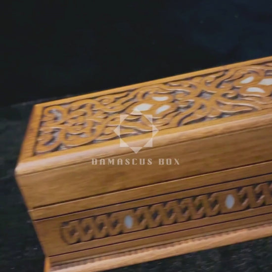 Questa scatola intagliata a mano rappresenta un alto livello dell’artigianato siriano, subito dopo lo stile Mashghal Arabi per prestigio. Ogni pezzo è impreziosito da autentica madreperla.